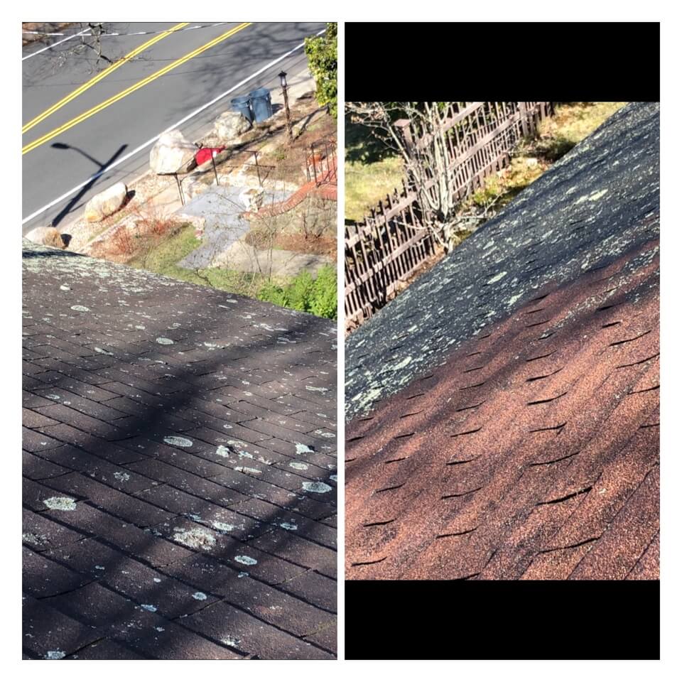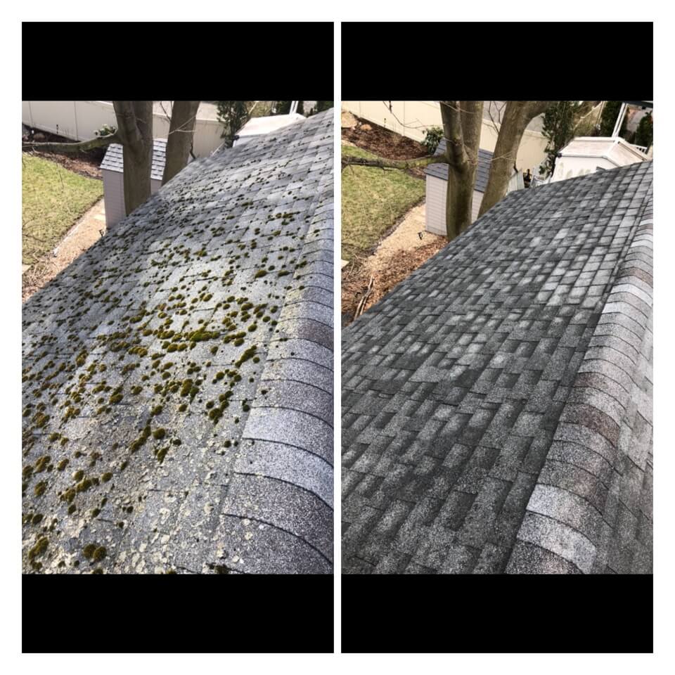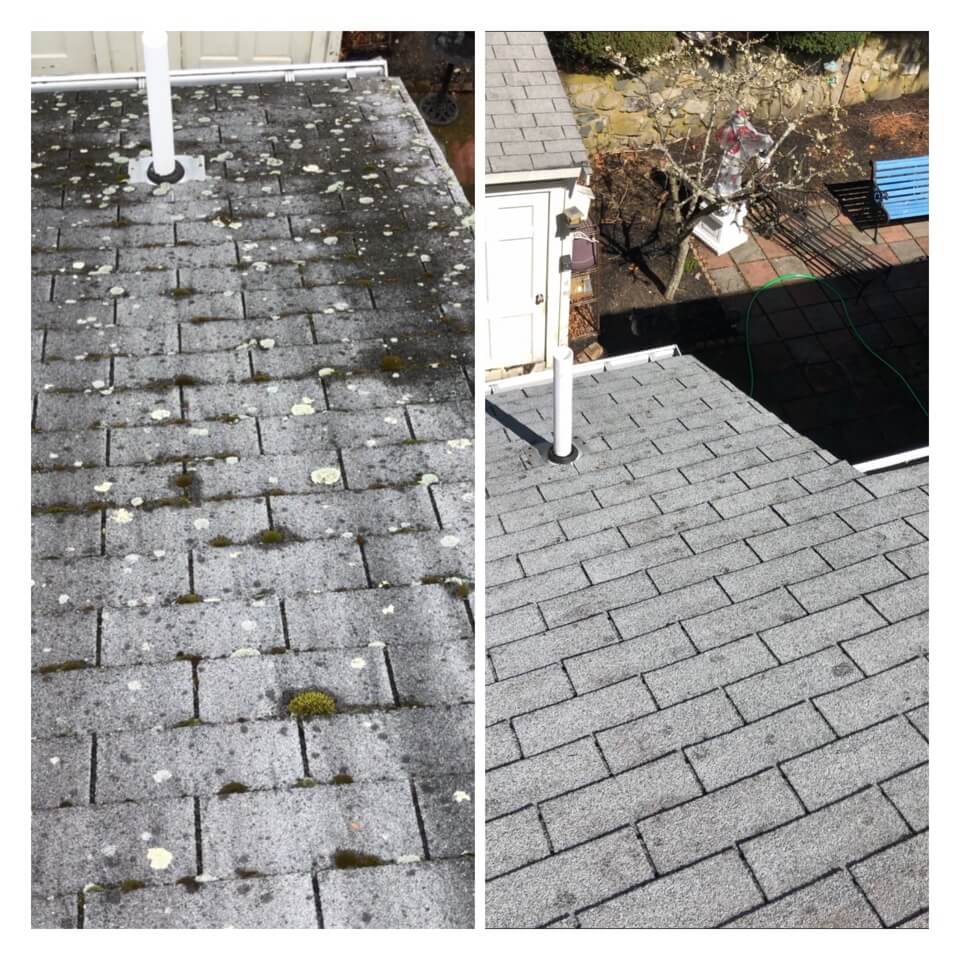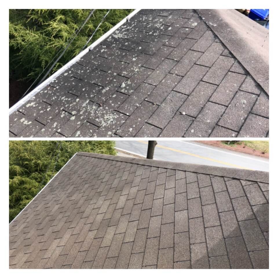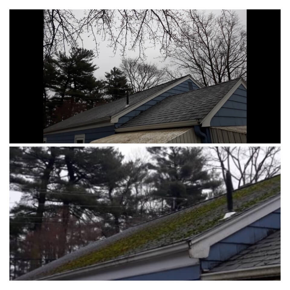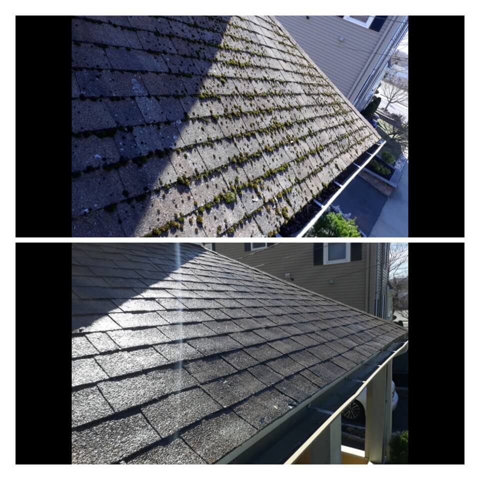 HiCleaners is the most experienced company in Littleton, MA that deals with roof washing and roof soft washing. All of our employees are trained to recognize precise solution mixing ratios to provide you with the safest and most effective soft washing service. Roofs are a commonly neglected part of a house due to the fact that most people don’t have ladders to access it, so it is very easy to just leave it alone and forget about problems that may start to arise. Just like many home owners, discoloration and small bits of moss on a roof can be overlooked because of the misconception that it is just aesthetic. However, it isn’t just aesthetic, the moss slowly lifts the granules off the shingles which in turn shorten the life of the shingle. The moss also spreads, just like any bacteria if it is left alone for too long, it can quickly become a problem that spirals out of control. Call HiCleaners for a free quote, we only use the most advanced eco-friendly solutions and equipment to make sure the job is done right, for the safety of the employees, your plants, grass, pets, and children.